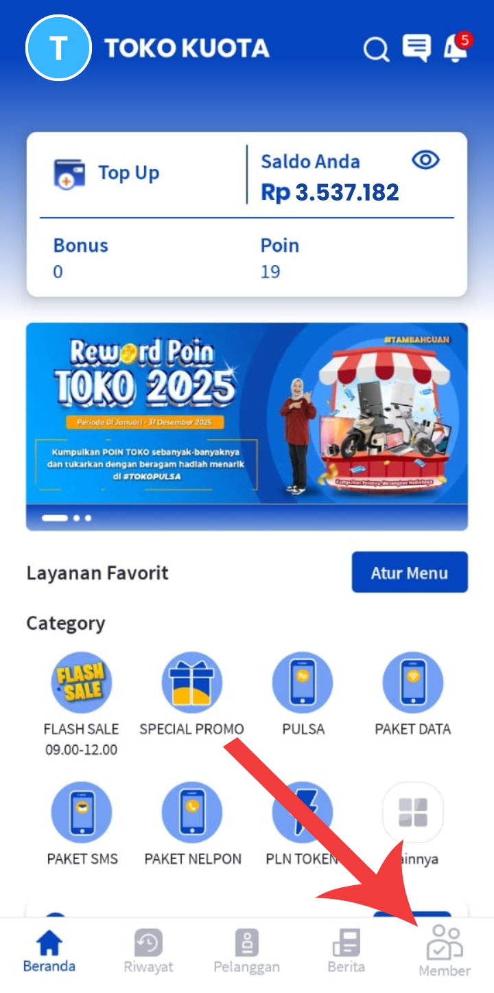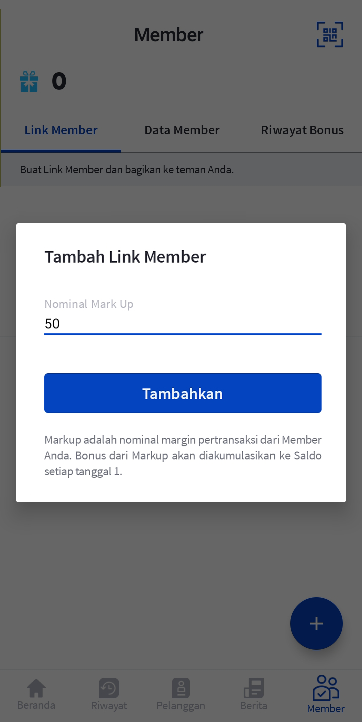 Cara mendaftarkan downline selain menggunakan format daftarkan downline yang dikirim melalui SMS, WhatsApp, Telegeram, dan juga sistem Autoreg, Anda juga bisa mendaftarkan downline melalui link referral yang diarahkan langsung ke aplikasi android. Link referral bisa didapatkan di aplikasi android akun anda. Klik “Member” di sisi kanan bawah. Lalu, klik “Link Member” untuk mendapatkan link referral. Setelah masuk di halaman “Link Member”, klik tanda “Tambah ( + )” di pojok kanan bawah. Kemudian isi “Nominal Mark Up“ sesuai dengan keinginan anda, misalkan 50, lalu klik “Tambahkan“.